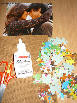 Для поделки из пазлов вам потребуется старая фоторамка, клей ПВА, некоторое количество старых пазлов, фотография (и по необходимости ножницы).