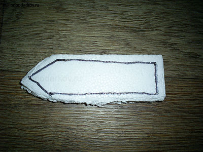 Сделайте из пенопласта треугольник с закругленной вершиной. Для начала можете вырезать нужную форму ножницами, а затем вручную обломить выступающие части. Обведите пенопластовую форму по краю черным маркером.