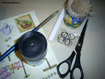 Для того чтобы сделать брелок, мы использовали такие материалы, как трехслойная салфетка с рисунком, лак, ножницы, зубочистки, пластику, кисточку, колечко для брелка.