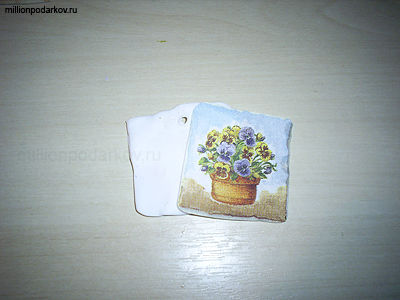 Из салфетки вырезаем нужный мотив, по его размеру делаем плоскую деталь из белой пластики, в нашем случае это квадрат с толщиной около 3 мм. Зубочисткой делаем отверстие. Варим 15 минут или запекаем в духовке. Отделяем верхний красочный слой салфетки, прикладываем бумажную деталь к пластиковому квадрату, смачиваем кисточку клеем ПВА, разбавленным немного водой и аккуратно разглаживаем салфетку по направлению от центра к краям, чтобы не было морщинок.