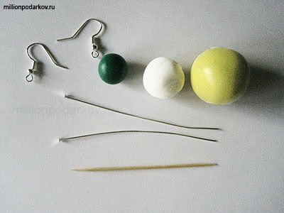Итак, для изготовления поделки нам понадобится пластика 3 оттенков –желтая, белая, зеленая, зубочистка, швензы ( крючки) – 2 шт, пины ( гвоздики)-2 шт. Готовим материалы к работе. Пластик следует размять, чтобы он был мягким и эластичным.