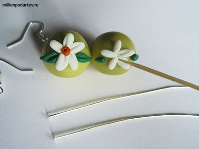 После запекания насадить на пины, загнуть концы крючками. Соединить со швензами (крючками для сережек).