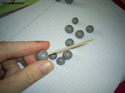 Катаем из пластики шарики. Желательно их делать одного размера. Теперь аккуратно с помощью зубочистки делаем в шариках дырочки. Для этого протыкаем палочкой шарик с одной стороны и с другой.