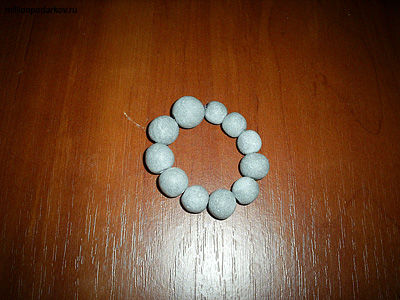 Варим бусинки или оставляем высыхать их согласно инструкции. Теперь нанизываем шарики на эластичную нитку. Завязываем концы и получаем вот такой замечательный браслет. В результате варки в воде у нас получился интересный «мраморный» эффект бусинок.