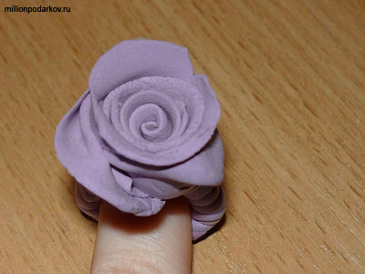 Одеваем цветок на кольцо и оборачиваем длинным кончиком-колбаской кольцо по всей окружности.