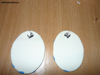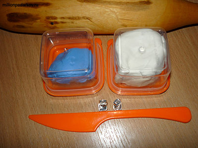 Для этой поделки вам потребуется пластика белого и голубого цвета, нож для пластики, серьги гвоздики, скалка, ножницы.