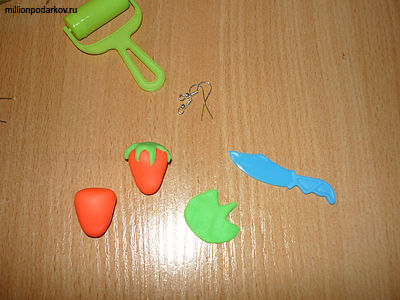 Лепим из розовой, красной или ярко оранжевой пластики ягодки. Затем берем небольшой кусочек пластики зеленого цвета. Раскатываем его, вырезаем из него чашелистик. Чашелистик крепим к ягодке.