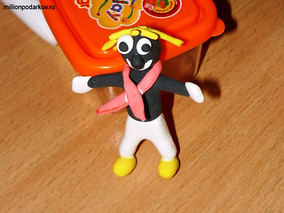 Для того, чтобы слепить такого человечка вам потребуется глина пластика различных цветов (белый, желтый, красный, темно коричневый), клей ПВА, пластмассовый нож.