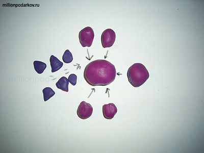 Из сиреневого пластилина делаем туловище, голову и лапки динозавра, из фиолетового – зубья на спине. Стрелки на фотографии указывают, какие детали куда присоединять.