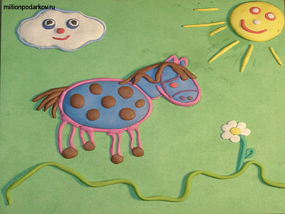 Поделка из пластилина для младших школьников картина "Лошадка на лужайке"