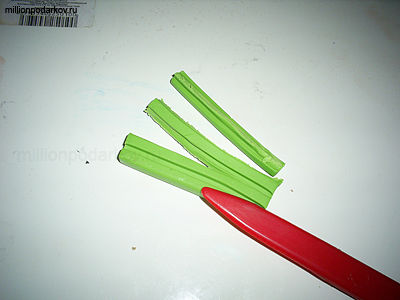 Берем пластилин и стеком разрезаем его на полоски одинаковой ширины.