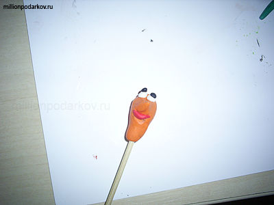 Делаем голову, скатав из оранжевого пластилина шарик. Надеваем его на шампур и формируем голову. В работе помогаем стеком.