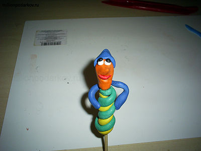 Скатываем колбаски из пластилина двух цветов и формируем туловище, обматывая ими шампур. Делаем ручки, шапочку.