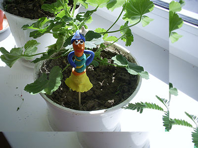 Нам осталось надеть человечку юбочку и вот замечательная поделка готова. Такие поделки из пластилина своими руками могут украсить цветочный горшок, создав замечательное настроение.