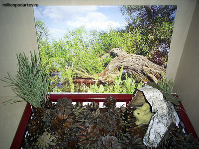 Предлагаем Вам сделать для своих детей вот такую замечательную поделку из подручного материала, листьев, шишек, пластилина, хвои, коры. В результате у Вас получится настольный театр в виде лесной полянки, на которой так интересно разыгрывать разнообразные сценки из жизни леса и его жителей.