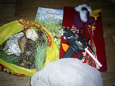 Для того чтобы сделать настольный театр мы использовали разнообразные подручные материалы. Так, нам пригодились шишки, листья, хвоя, шерсть, кора деревьев, коробка из-под конфет, старый календарь с фотографиями природы. Кроме того, мы использовали пластилин, клей ПВА и ножницы.