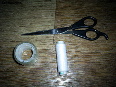 Для нашей поделки из подручных средств мы приготовили нитки, скотч и ножницы.