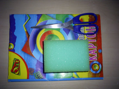 Для изготовления цветов нам понадобится обычная кухонная губка зеленого цвета, цветной картон и ножницы. От губки отделим верхний абразивный слой. Он нам не пригодится.