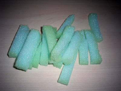 Теперь разрезаем губку на полоски. Они должны получиться шириной по 1-2 см. Из полосок бы будем делать стебли цветов. Если вы будете разрезать губку вдоль, то и стебли получатся более длинными, а если поперек – то более короткими. Если кухонная губка очень толстая, то получившиеся полоски можно будет разрезать еще раз поперек на две равные части.