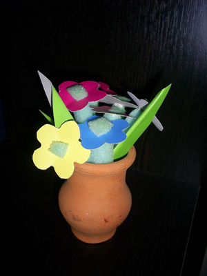 Теперь из цветного картона вырезаем чашечки цветов с пятью лепестками. В середине делаем ножницами отверстие и вставляем туда стебель. Вырезаем из зеленого картона листочки, складываем их пополам. В итоге у нас получаются замечательные цветы, которые можно разместить в вазочке.
