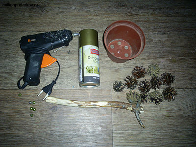 Итак, нам для изготовления данной поделки из природного и бросового материала нам понадобятся сосновые шишки, ветка, вазон, аэрозольная золотая краска, клеевой термопистолет, бусинки и гипс.