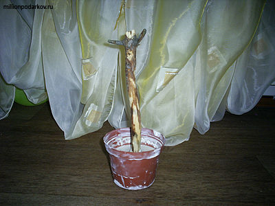 Очищаем палку от грязи и от части коры. Ставим ее посередине горшка, разводим гипс водой до состояния густой сметаны и заливаем им пространство вокруг палки. Оставляем сохнуть.