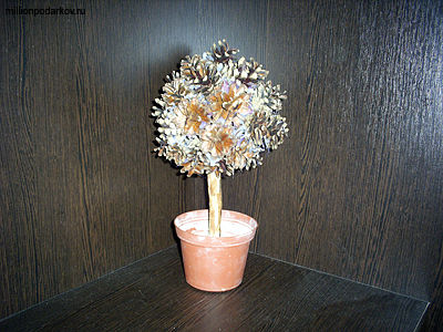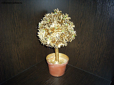 Красим дерево золотой аэрозольной краской. Сверху горшочек можно декорировать мхом, искусственными материалами или оставить так, как есть. С помощью клеевого термопистолета приклеиваем бусинки. Вот и все, наше дерево готово.