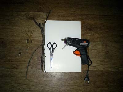 Для изготовления поделки подготовьте такие материалы, как картон, ветки дерева, кора, сухая трава и клей.