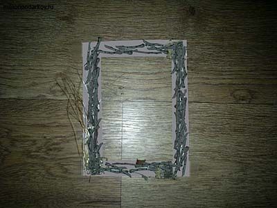 Теперь подберите необходимые природные материалы, такие как ветки дерева, кора, камушки, сухая трава. Очистите их от грязи и пыли. Покрасьте рамку в нужный цвет. Приклейте все подобранные материалы с помощью горячего силиконового пистолета или другого хорошего клея.