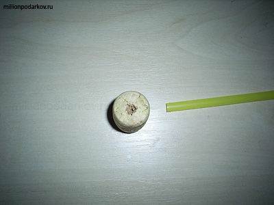 Ножницами проделываем в корке отверстие для трубочки и вставляем ее в пробку. Для того чтобы трубочка лучше держалась, заполняем отверстие клеем ПВА.