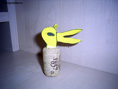 На цветной бумаге рисуем черным маркером голову аиста. Вырезаем ее. Делаем на обратном конце пробки ножницами надрез, наливаем туда немного клея ПВА и крепим вырезку.