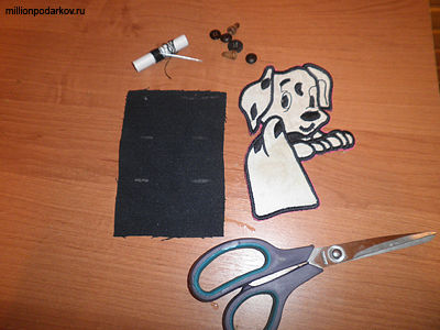 Ткань, на которую будем пришивать щенка, лучше взять контрастного цвета. Оверлочим, а можно просто сделать ровные края.