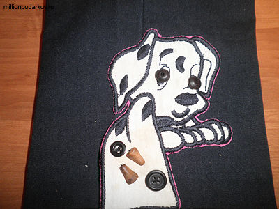 Готового щенка пришиваем к большому лоскутку ткани. Поделки из пуговец детские представляют собой законченный результат. Такое изделие подойдет в качестве развивающей моторику рук игрушки и для малыша.