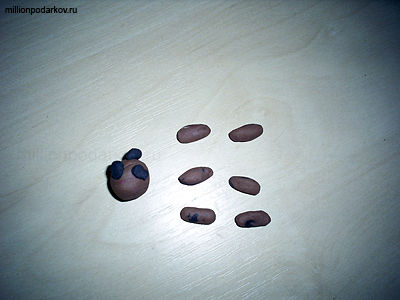 Сделаем из пластилина лапки жучка, голову, глазки, носик.