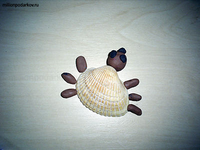 Теперь соберите все составные элементы, приклеив пластилиновые детали к ракушке. В итоге у нас получилась замечательная смешная поделка. Таких жучков можно сделать множество, а затем соорудить дома настоящий инсектарий.
