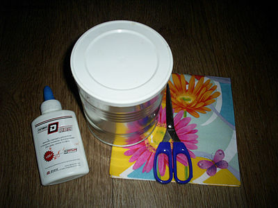 Для изготовления поделки из салфеток нам понадобится одна салфетка с красивым цветным рисунком, жестяная банка из-под детского питания, ножницы, клей ПВА, акриловая краска желтого или оранжевого цвета и кисточка.