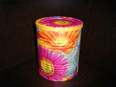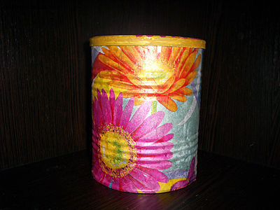 Итак, отделяем от салфетки верхний цветной слой. Промазываем жестяную банку клеем ПВА и аккуратно приклеиваем к ней салфетку. Следующий слой вклеиваем встык к предыдущему. Не забываем обклеить и дно банки.