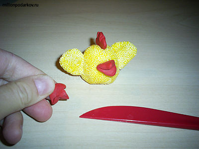 Из красного обычного пластилина делаем клюв, гребешок и лапки. В работе помогаем себе стеком.