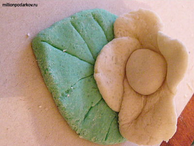 После того как мы сделали тесто сделаем из него листочек и сделаем цветок, а с помощью зубочистки сделаем линии на нашем листе.