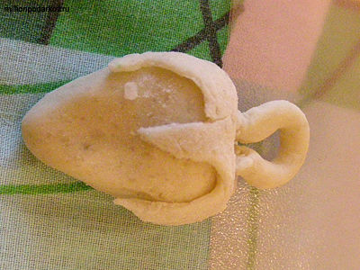 Возьмём нами приготовленное тесто и будем изготовлять клубничку как на фото.Затем дадим застыть нашей поделке.