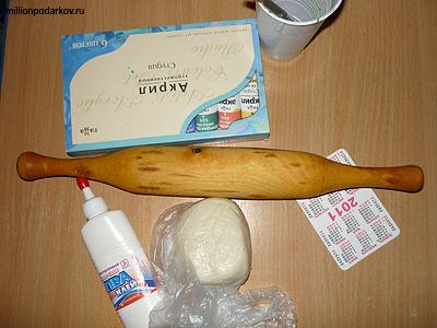 Для поделки «Кролик с календариком» вам потребуется соленое тесто, карманный календарь, скалка, акриловые краски, клей ПВА, толстая нить, стаканчик с водой и кисть. Соленое тесто готовится так: пол стакана соли «Экстра», пол стакана муки и четверть стакана воды. Все ингредиенты смешиваются, а затем тесто помещается в холодильник минимум на 2 часа. После этого из теста можно будет лепить.