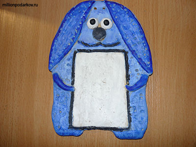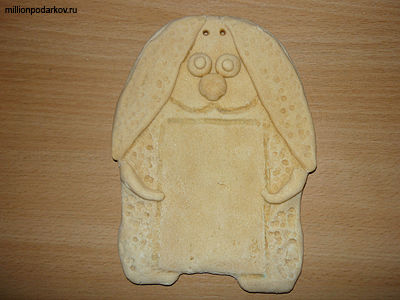 Лепим из теста основу. Для этого раскатываем тесто скалкой, а затем тупым концом кисти наносим рисунок. Делаем из теста глаза, нос, лапки и ушки, приклеиваем их к основе, затем делаем отверстия для крепления. После этого ставим в разогретую до 50 градусов духовку на 2,5 часа.
