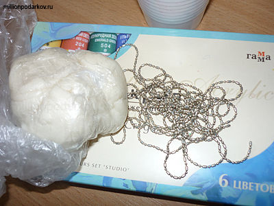 Для медали нам потребуется соленое тесто, акриловые краски, цепочка, стакан с водой и кисть.