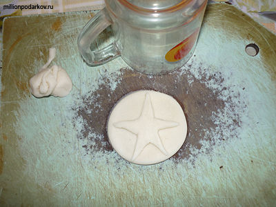Лепим из теста медаль. Для этого раскатываем тесто на доске, затем стаканом выдавливаем круг. После этого лепим звездочку и кладем аккуратно в центр круга. Делаем в тесте отверстие, для того, чтобы потом можно было медаль подвесить на цепочку. После того, как изделие слеплено мы помещаем его в духовку, разогретую до 50 градусов, и выпекаем там в течении 1,5 часов.