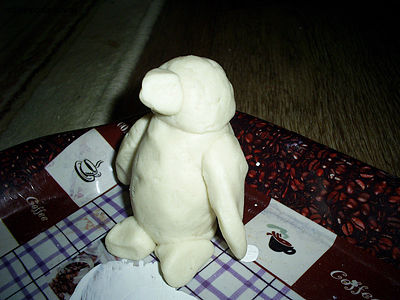 Теперь лепим пингвина из теста. Для этого из раскатанной лепешки делаем туловище на основе из фольги, добавляем крылья, лапки, голову и клюв.