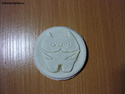 Лепим из соленого теста будущий магнитик. Для этого раскатайте кусочек теста, придайте ему круглую форму с помощью стакана, затем вырежьте ножом кота и аккуратно положите кота на кругляшек. Дайте изделию высохнуть у батареи, либо в духовке при температуре 50-80 градусов.