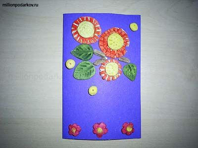 Раскрасьте поделки акварельными красками. Возьмите лист цветного картона и согните его пополам. Клеем ПВА приклейте изделия из теста, формируя красивую композицию. Все – наша чудесная «соленая» открытка готова! Осталось лишь кому-нибудь ее подарить.