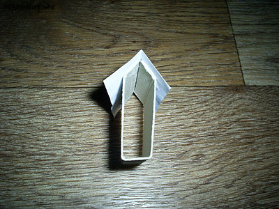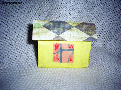 У спичечного коробка сбоку аккуратно разводим стенки и делаем из них крышу домика. Из цветной бумаги вырезаем полоску по форме крыши и приклеиваем к поделке.