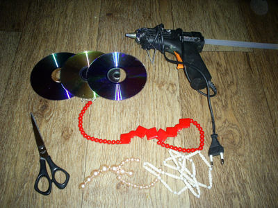 Для этого нам понадобятся три диска, ножницы, клей и бусины для украшения.