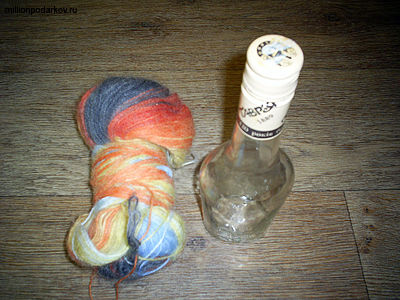 Для изготовления поделки вам понадобятся разноцветные нитки, стеклянная бутылка и клей ПВА. Пробку можете раскрасить акриловыми красками.